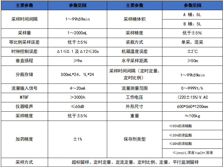 一、执行标准:HJ/T372-2007《水质自动采样����� �������Ƴ������������ �������Ƴ������������ �������Ƴ������������ �������Ƴ������器技术要求及检测方法》 HJ 493-2009《水质样品����� �������Ƴ������������ �������Ƴ������������ �������Ƴ������������ �������Ƴ�������的保存和管理技术》 HJ/ 91.1-2019����� �������Ƴ������������ �������Ƴ������������ �������Ƴ����������� �������Ƴ�������《污水监测技术规范》 HJ/ 353-2019《水污染源在线监����� �������Ƴ����� �������Ƴ������������ �������Ƴ������������ �������Ƴ������������ �������Ƴ��������������测系统(CODcr、NH3-N等)安装技术规范》 二、产品概述:本产品可实现排放口污水的连续混合采集,将混合样供在线分析设备分析之用,以实����� �������Ƴ������������ �������Ƴ������������ �������Ƴ������������ �������Ƴ�������现排放口污水混合样的监测功能,解决传统在����� �������Ƴ������������ �������Ƴ������������ �������Ƴ������������ �������Ƴ�������线监测是以等时间间隔对排放点污水进行监测,而����� �������Ƴ������������ �������Ƴ������������ �������Ƴ������������ �������Ƴ�������水质分析仪表的分析周期往往比较长,因此所����� �������Ƴ������������ �������Ƴ����������� �������Ƴ������������ �������Ƴ�������得到的监测数据只是等时间间隔的一组污����� �������Ƴ������������ �������Ƴ������������ �������Ƴ������������ �������Ƴ�������水排放数据,无法真实反映其排放口的污染物排放总量����� �������Ƴ������������ �������Ƴ������������ �������Ƴ������������ �������Ƴ�������的问题。可为污水排放的总量监控、超标留����� �������Ƴ������������ �������Ƴ������������ �������Ƴ����������� �������Ƴ������样提供一种强有力的����� ������������ �������Ƴ������������ �������Ƴ����������� �������Ƴ������������ �������Ƴ�������Ƴ�������技术手段。 三、主要特点:1、A/B 双桶配置:配置 A/B 双桶,����� �������Ƴ������������ �������Ƴ������������ �������Ƴ������������ �������Ƴ�������实现连续混合样采集、仪表供样以及超标留����� �������Ƴ������������ �������Ƴ������������ �������Ƴ������������ �������Ƴ�������样功能; 2、主/被动工作模式:当该产品集成于分析����� �������Ƴ������������ �������Ƴ������������ �������Ƴ������������ �������Ƴ�������系统时,既可以作为主控设备,控制分析仪等设备运行����� �������Ƴ������������ �������Ƴ������������ �������Ƴ������������ �������Ƴ�������;也可以根据数采仪的控制指令����� �������Ƴ������������ �������Ƴ������������ �������Ƴ������������ �������Ƴ�������执行采样任务,系统集成非常方便; 3、等比例混合采样功能:可按照等时间����� �������Ƴ������������ �������Ƴ������������ �������Ƴ������������ �������Ƴ�������间隔或者等流量间隔进行混合����� �������Ƴ������������ �������Ƴ����������� �������Ƴ������������ �������Ƴ�������采样,间隔时间、流量以及采样量均可灵活设置; 4、多种仪表供样模式:支持主动供样���